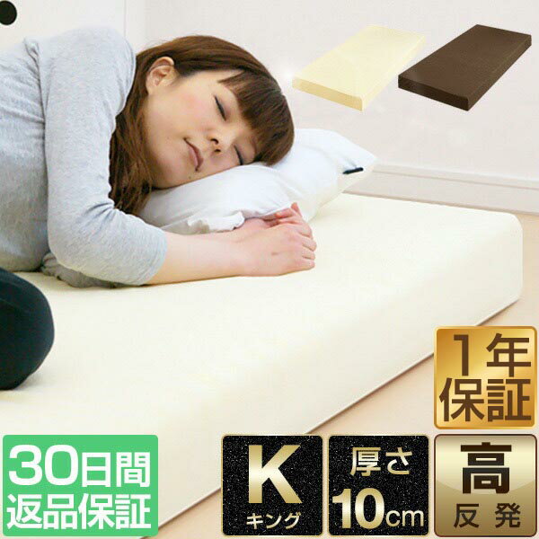 キャッシュレス 還元 キャッシュレス5%還元対象身体をしっかり支え、理想の寝姿勢をキープ!弾性の高いウレタンフォームで身体をサポート! 高反発マットレス(密度30D/硬さ200N) 10cm キングサイズ [2カラー] 商 品 詳 細 サイズ (約)195cm×180cm×10cm キングサイズ 重量 (約)12kg 材質 マットレス本体 : 高反発ウレタン(密度30kg/m3) カバー : ポリエステル100% 硬さ 200ニュートン カラー ・クリーミーホワイト ・ブラウン 特記事項 ※圧縮梱包されたままの状態で長期間保管した場合、マットレスが復元できなくなってしまいます。